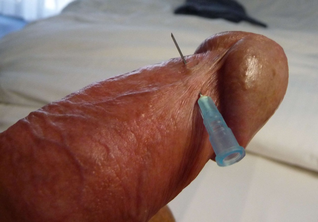 Wahrscheinlich wird es zuerst ein Frenulum-Piercing. Um eine Idee dafür zu bekommen, wie es mir in einem Studio ergehen könnte, habe ich mich in einem Selbstversuch mit einer sterilen Nadel selbst gestochen. Es war ein phänomenales Gefühl, dass ich von Zeit zu Zeit wiederhole. Nun weiß ich nicht, was mehr bringt. Ein permanentes Piercing oder das Stechen selbst?