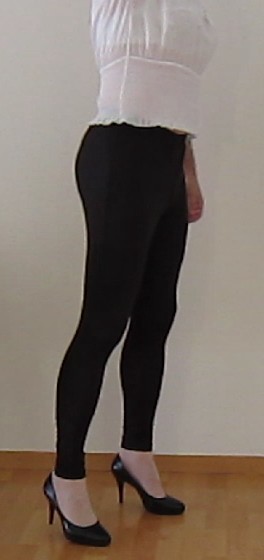 Weiße Bluse, schware Leggings, weiße Strümpfe, schwarze Pumps