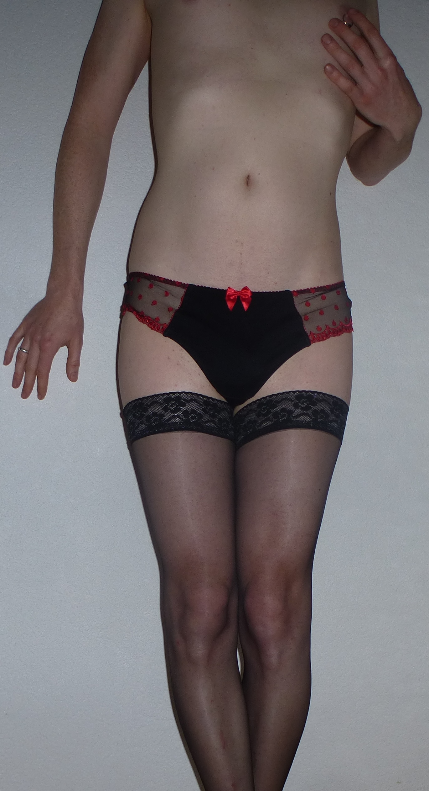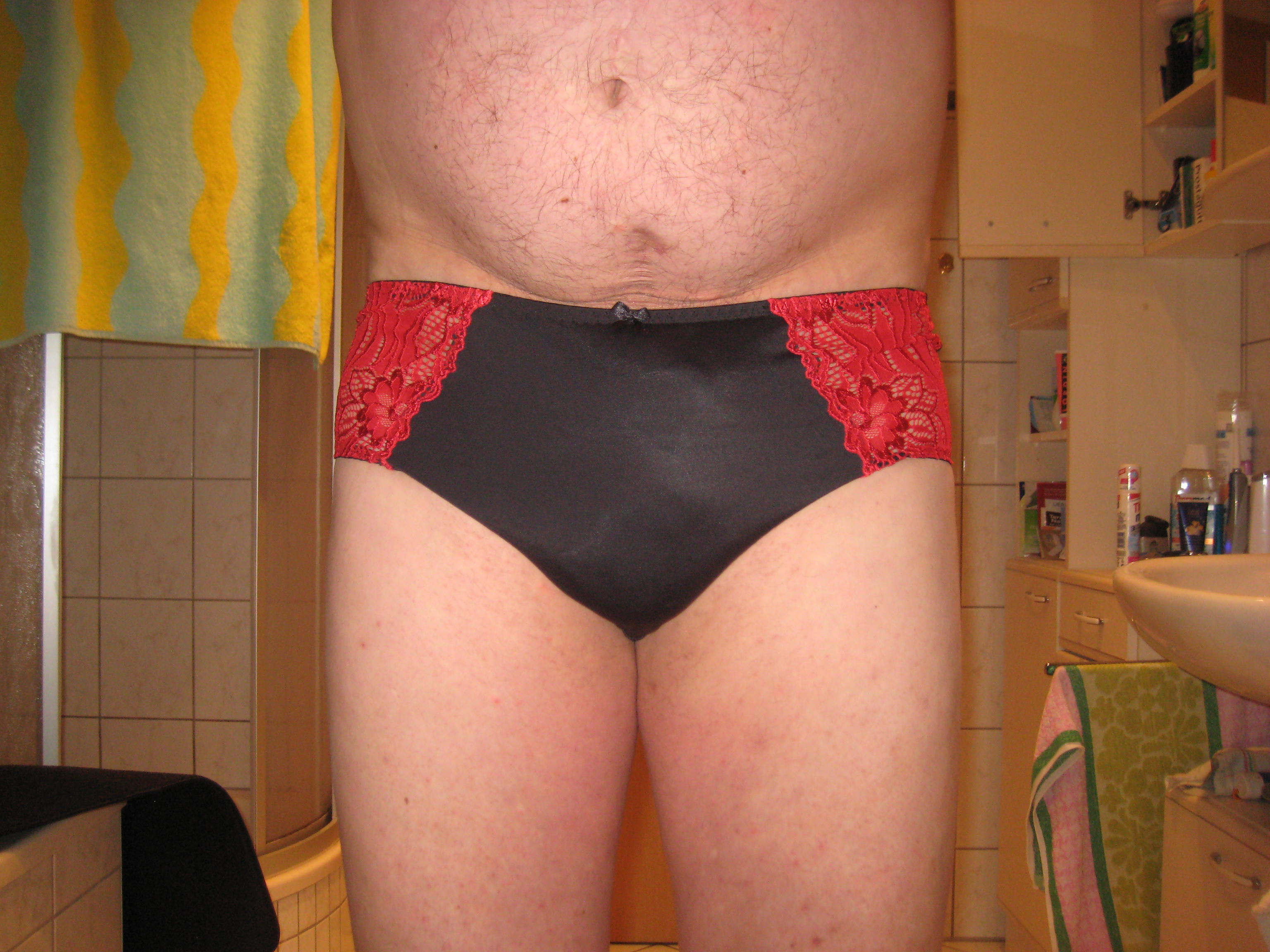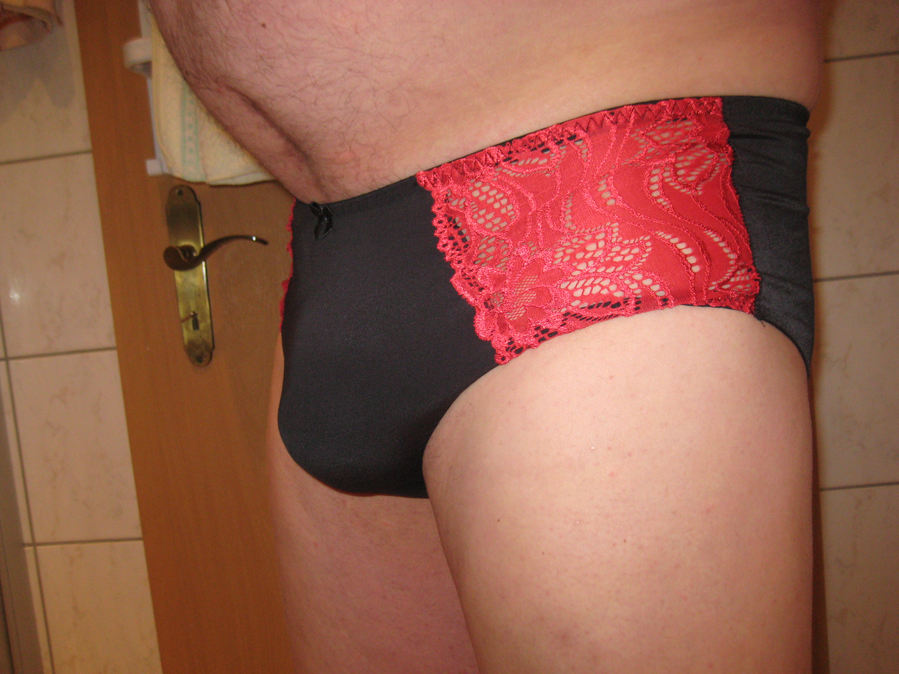 haggi63 Heute früh mal schwarz mit rot aus der schublade genommen. Ist zwar ein Damenslip, aber der nimmt auch die Anbauteile der Männer ganz gut auf. Und fühlt sich ganz zart an.
