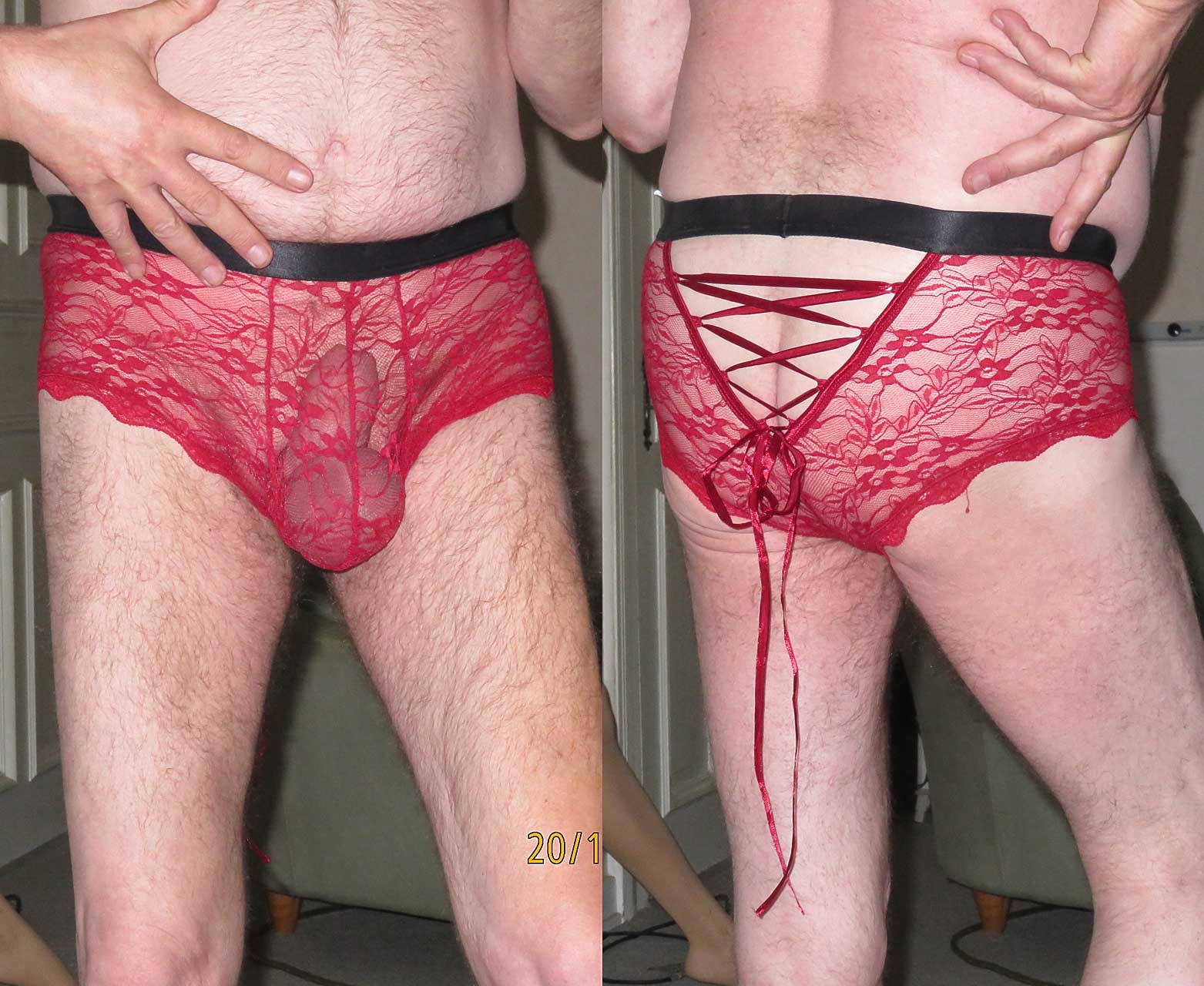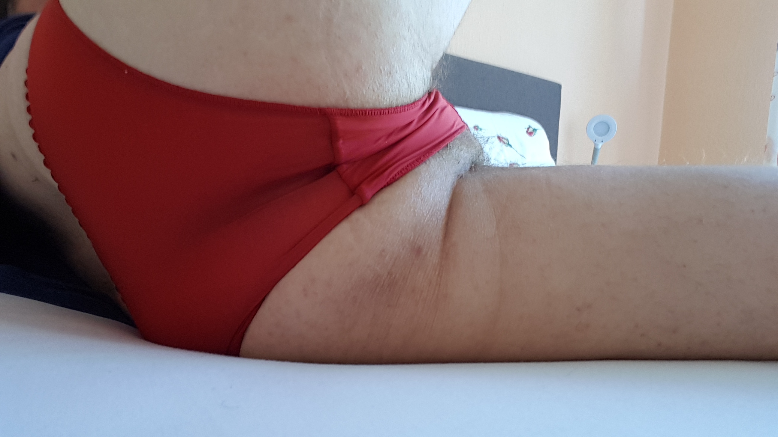 Die Slips sind echt mein schwierigstes Thema beim Crossdressing. Es ist sogar leichter für mich, an Schuhe in Gr. 47 rankzukommen, als einen Slip zu finden, in den alles reinpasst (da ich gerne zwei Ringe trage, gibt es da Einiges zu verstauen) und der zugleich sexy aussieht. Ich habe mir nun mal dieses Teil hier zugelegt, das für Männer konzipiert ist, also eine ordentliche Ausbuchtung für die "Sissy-Clit" mitbringt. Da passt nun zwar alles problemlos rein und bleibt dann auch dort, aber schön ist ja was anderes ... :(