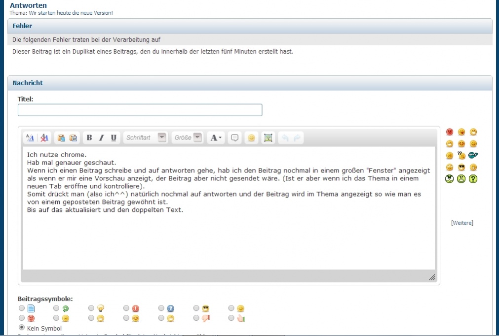 Wenn ich einen Beitrag schreibe und auf antworten gehe, hab ich den Beitrag nochmal in einem großen "Fenster" angezeigt als wenn er mir eine Vorschau anzeigt, der Beitrag aber nicht gesendet wäre. (Ist er aber wenn ich das Thema in einem neuen Tab eröffne und kontrolliere).