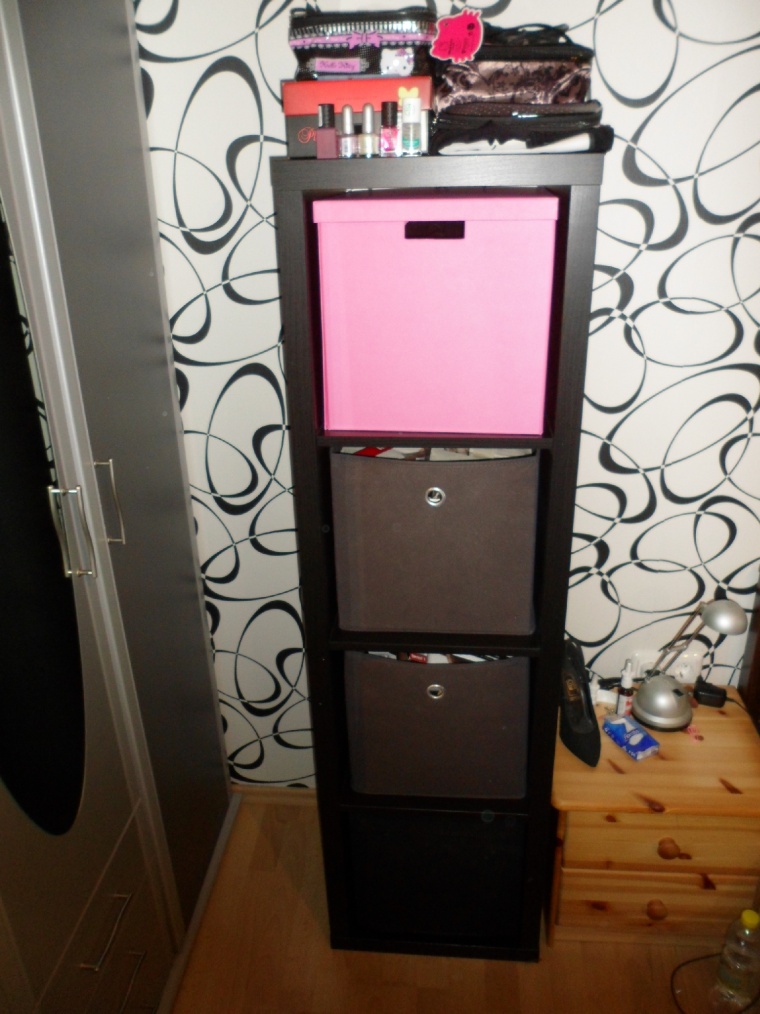 Regal steht an Kosmetiktäschen und Kisten ist übrigen voll mit meinen Nagellacken ;)