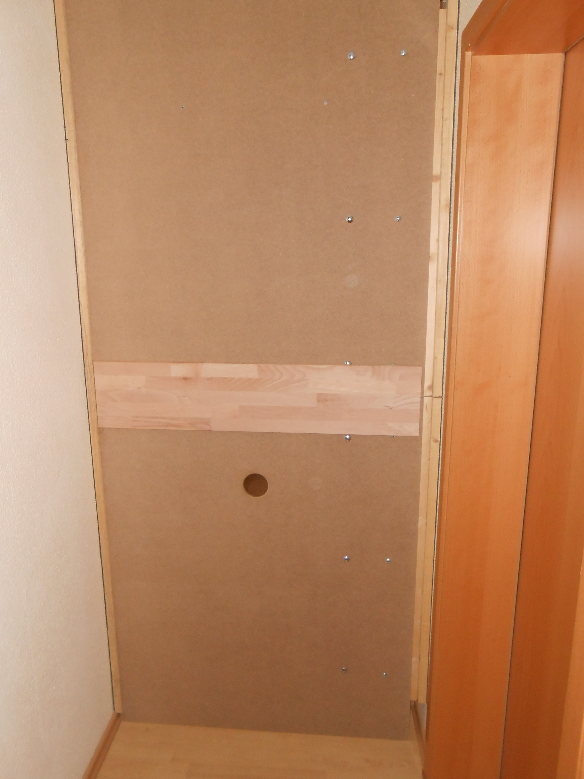 Ich fing dann die anderen Teile so zu fertigen das ich die 2 Platten dann übereinander Stellen konnte und sie dann zwischen mein Beide Wände im Flur zu klemmen, mit mehren Excenter und den 2 Holzbretter die ich an den MDF Platten zu befestigte das sie zum verklemmen geeignet waren.