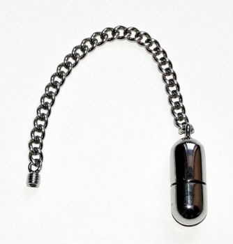 Dieser SOS- Anhänger ist meine neuste Errungenschaft, die kurze Kette sorgt dafür, dass der Anhänger unterhalb der Labien frei schwingen kann. Diese formschöne Kapsel bietet Platz für eine kleine (Liebes-) Nachricht auf Papier oder ein Medikament in Tablettenform.