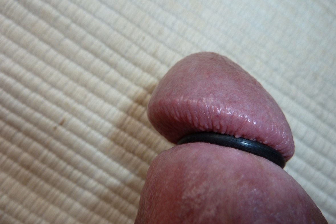 ich trage einen normalen Grösse 74 = 23,6 cm und 12 mm breiten Edelstahlring innen bombiert=abgerundet unterhalb meiner Eichel.