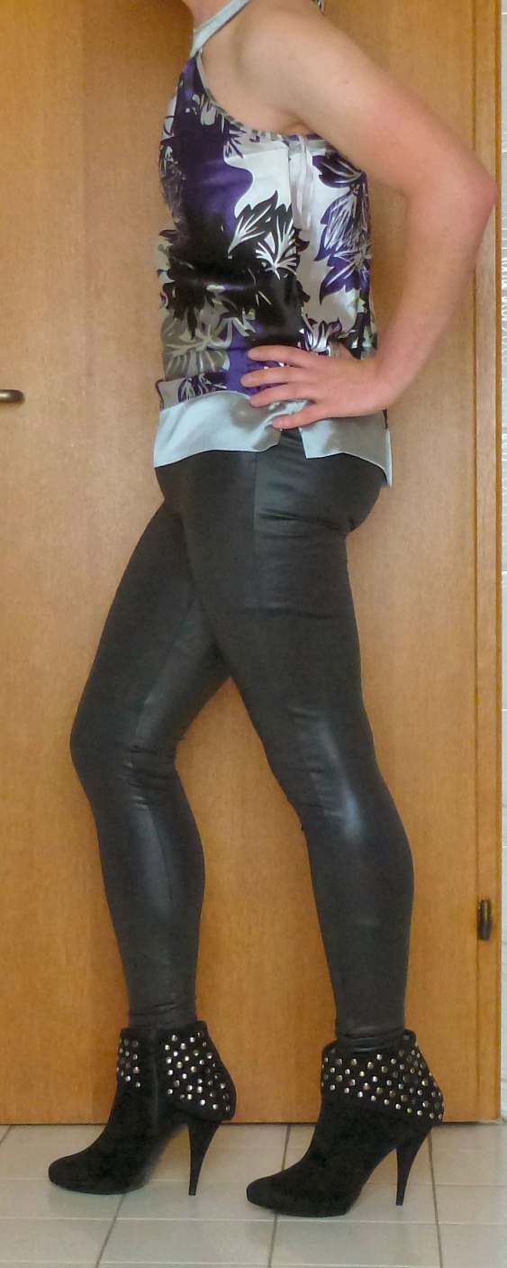 satin oberteil, lederleggins und sexy nuttenstiefeletten