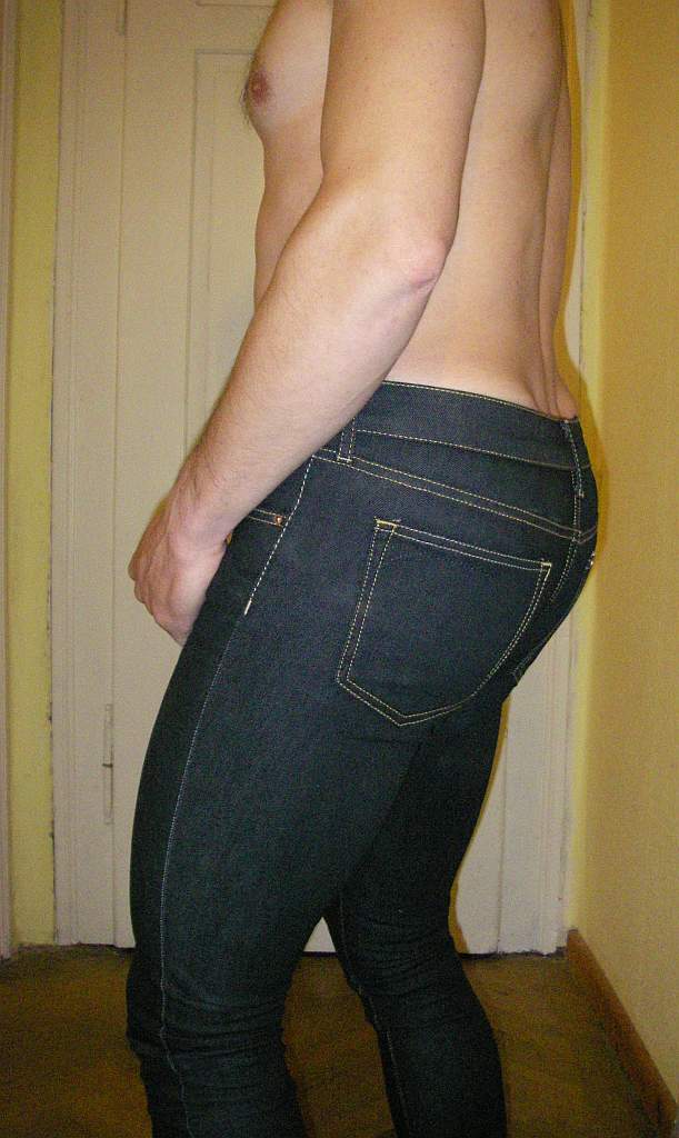 Die gute Nachricht: Es gibt sie noch, zumindest diesen Beinschnitt! Schaut doch einfach mal in den Onlineshop von H&M. Da habe ich heute Nacht in Dunkelblau eine "Fit High Sqin" (39,95) und eine blaue "Fit Super Sqin" (29,95) gesehen. In Hellblau haben sie auch noch eine "Fit Squin". Sind alle eigentlich für Girls gedacht, aber wer fragt da schon danach, wenn man damit in die Umkleide geht oder an die Kasse. Lasst euch nicht mit "Fit Slim" abspeisen. Das ist was für Weicheier, schlabbert unten an den Waden. Auch von gewöhnlichen Stretchjeans halte ich nichts. Das ist für Mollige, die auch mal was enges wollen (hab nix dagegen) und sieht obendrein beim Mann megaschwuchtelig aus (da hab ich auch nichts dagegen, ist aber nichts für mich). Bei den "Squins" hingegen schmiegt sich nicht der Stoff an den Körper, sondern der Körper wird gnadenlos in den Stoff gepresst. Bei meiner, ich hab sie ca. 2008 gekauft, ist die Bundhöhe so niedrig, dass bei eingezogenem Bauch und erigiertem Schwanz die Eichel oben rausschauen würde, wenn ich den Bengel nicht grundsätzlich ins linke Bein verbannen würde, wie man sieht.
